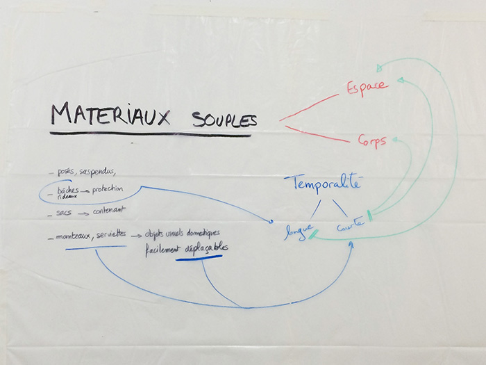 Après plusieurs mois d’échanges avec l’une et l’autre, Jade Tang propose, en 2016, de réunir cette possible équipe pour une journée de travail. Dans un atelier, pas dans un bureau. Ce sera un “labo”. La journée se veut sans ordre du jour ni enjeux définis. La salle, située au sein d’une friche artistique détruite depuis, propose plusieurs espaces de travail : deux tables, des murs couverts de bâches prêtes à recueillir toutes inscriptions spontanées, et aussi le sol. Parmi les objets à manipuler, des feutres, des feuilles, du scotch. Une photographie imprimée en grand format est accrochée sur une des cloisons, quelques amorces de pièces artistiques apparaissent, et l’intégralité des photographies de chantier prises par Jade Tang est imprimée au format 10 x 15 cm. Durant la journée, ces images sont brassées, triées, assemblées, jouées, juxtaposées. Au fil de discussions libres sur les images produites par la plasticienne, qui s’interroge sur leur statut (documents ? œuvres ? corpus d’images ? sources d’inspiration ?…), elles deviennent des supports vers l’émergence de potentielles catégories. Chacun·e des trois protagonistes oublie ses appartenances statutaires, professionnelles, culturelles, on discute de ce que ces images montrent et invitent à désigner et à décrire, sans conceptualisation préalable. Les manipulations successives questionnent la possibilité de regrouper ces images. Mais sur quels critères ? Qu’y voit-on qui permettrait de les associer ou de les distinguer en groupements thématiques concrets ou induits ? Y a-t-il des formes, des lumières, des outils, des matières ou des couleurs qui s’en dégagent et amèneraient vers des pistes significatives ? Ce premier rendez-vous a permis de mettre l’équipe au travail, en faisant, à partir de documents et d’un dispositif disponible pour une manipulation et une réflexion communes.
