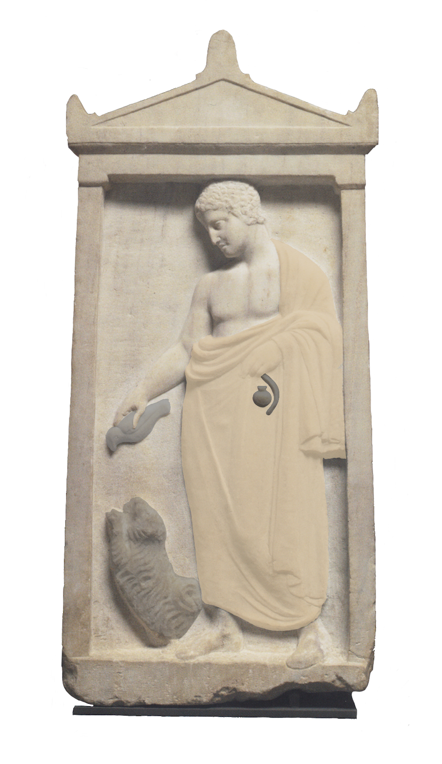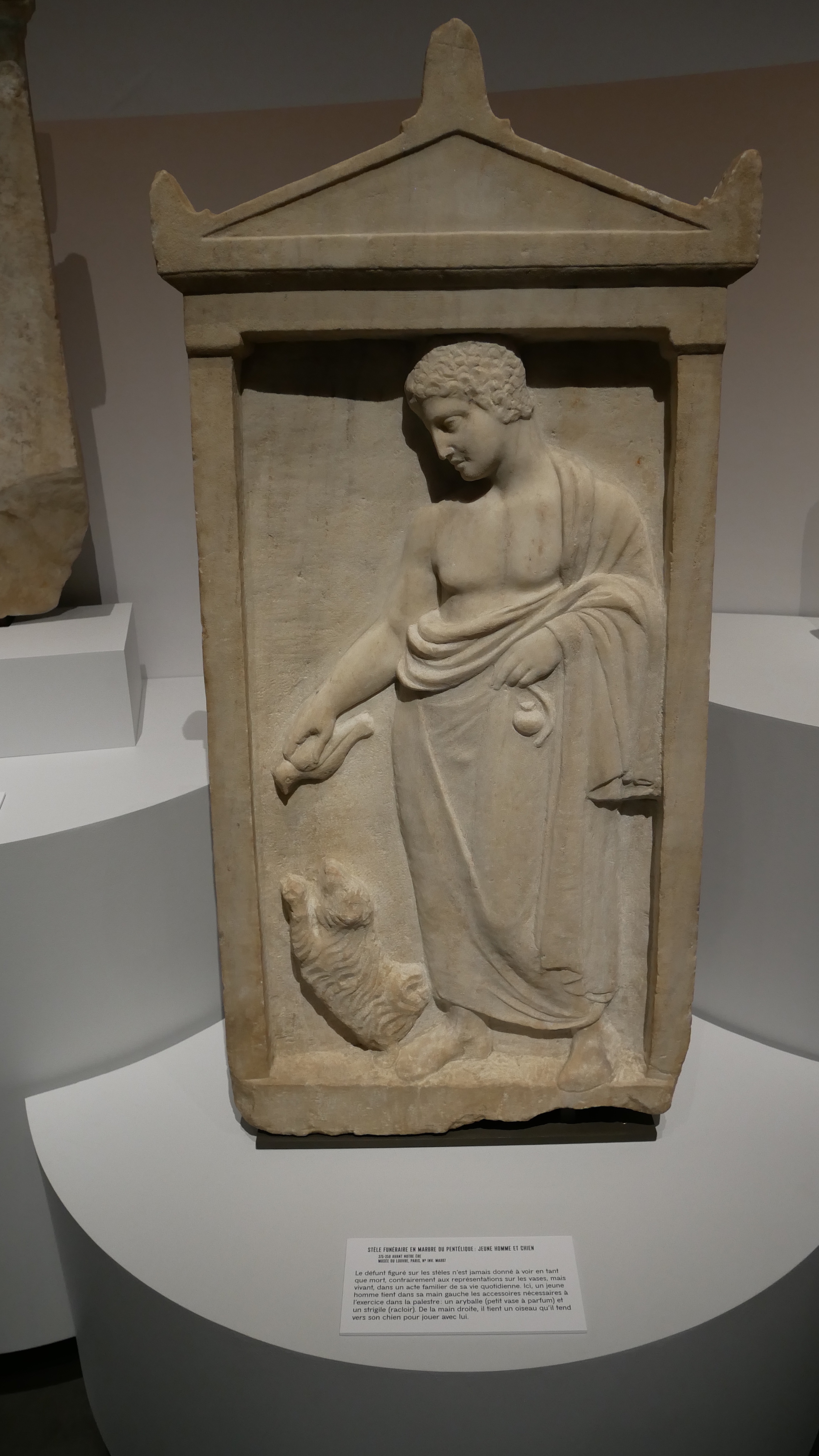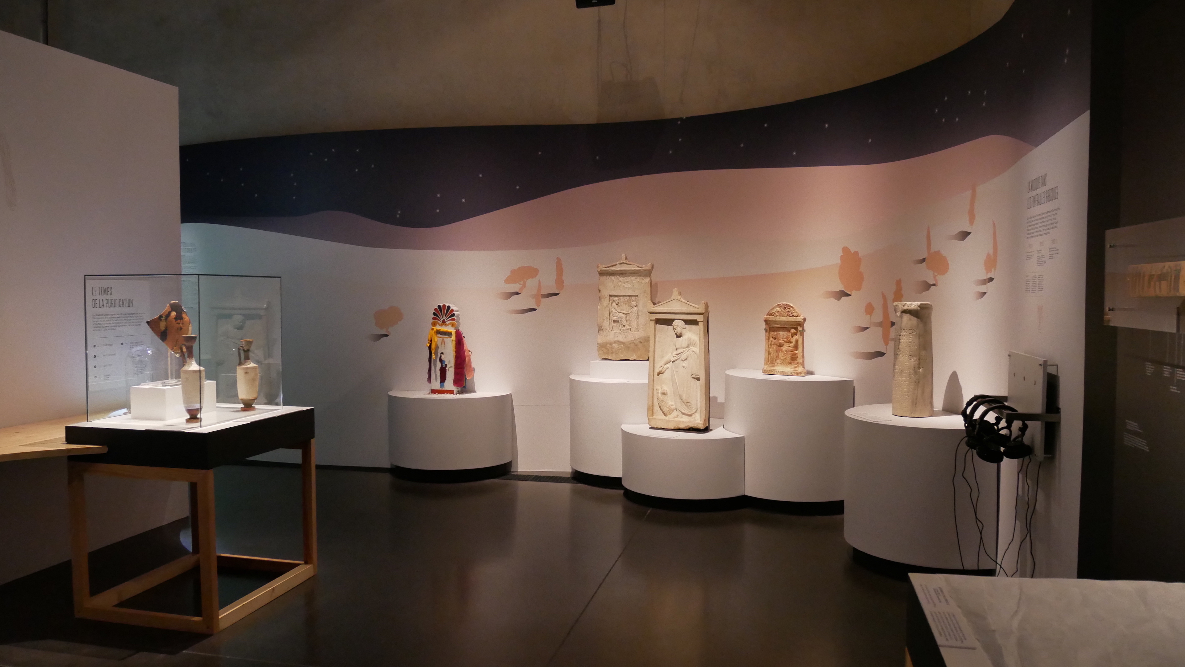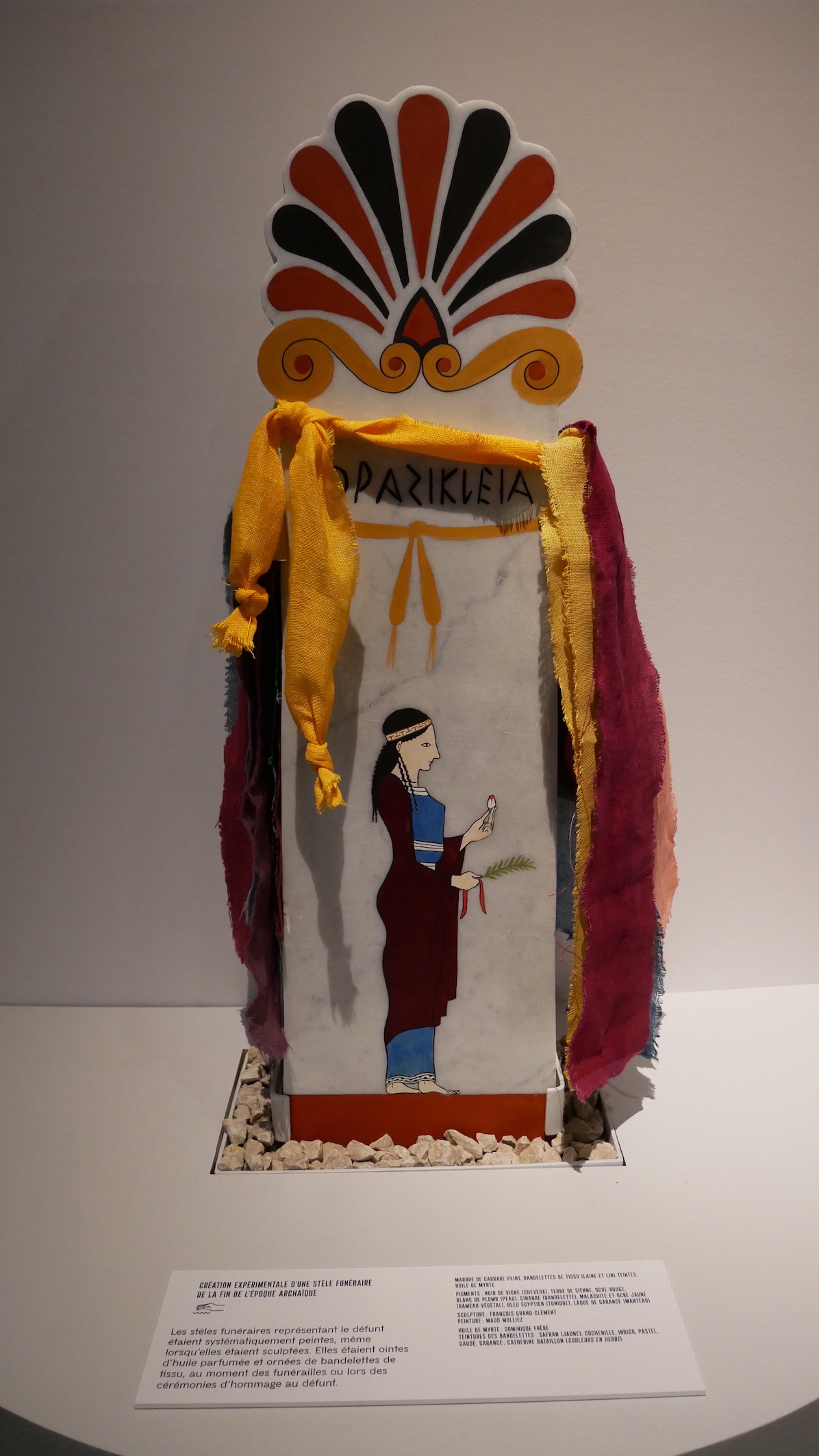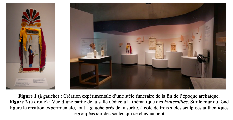 [10] L’exposition trouve sa genèse dans un projet de recherche pluridisciplinaire, visant à comprendre le régime polysensoriel des Grecs anciens (commissariat scientifique : Adeline Grand-Clément). Le propos de l’exposition est divisé en quatre thématiques, chacune prenant place dans des espaces distincts. Le visiteur, amené à découvrir les différents rituels qui régissent la vie des Grecs, découvre successivement le Mariage, le Sacrifice, le Banquet et les Funérailles. La muséographie consiste à présenter de manière complémentaire deux types d’objets, authentiques et expérimentaux, parfois augmentés d’éléments scénographiques destinés à les contextualiser. Le dispositif de médiation étudié, une stèle funéraire expérimentale, se situe dans la dernière thématique, à la fin de l’exposition.