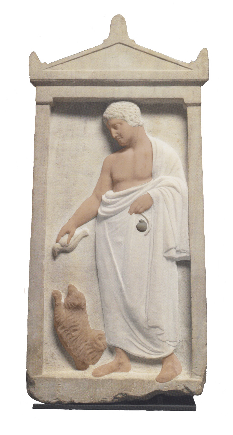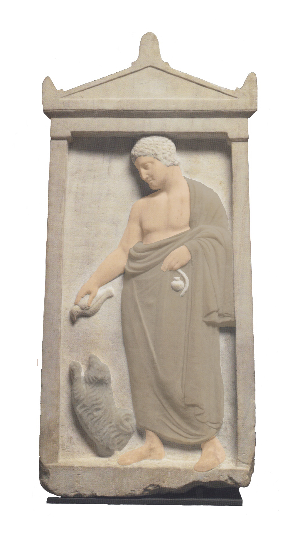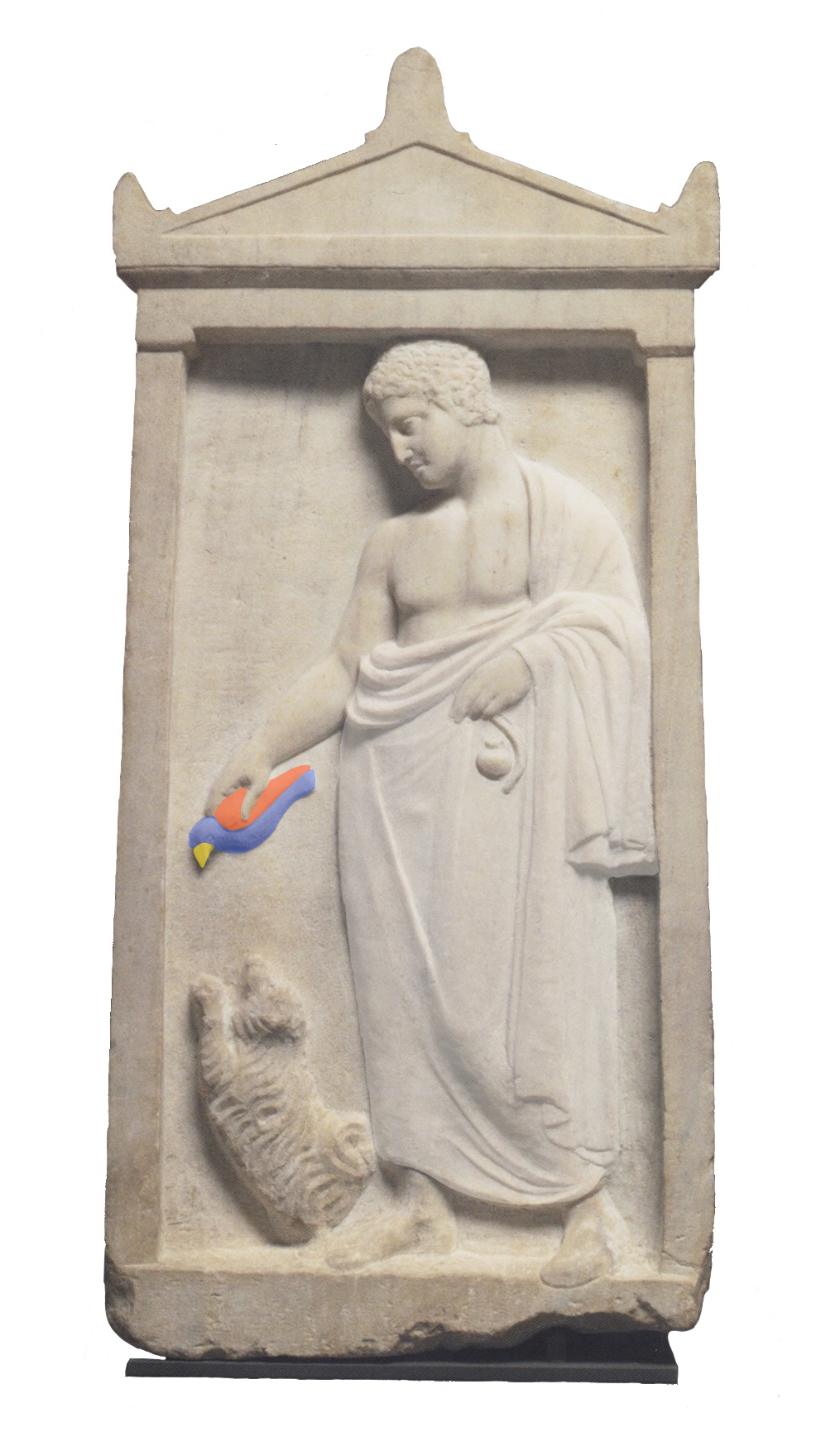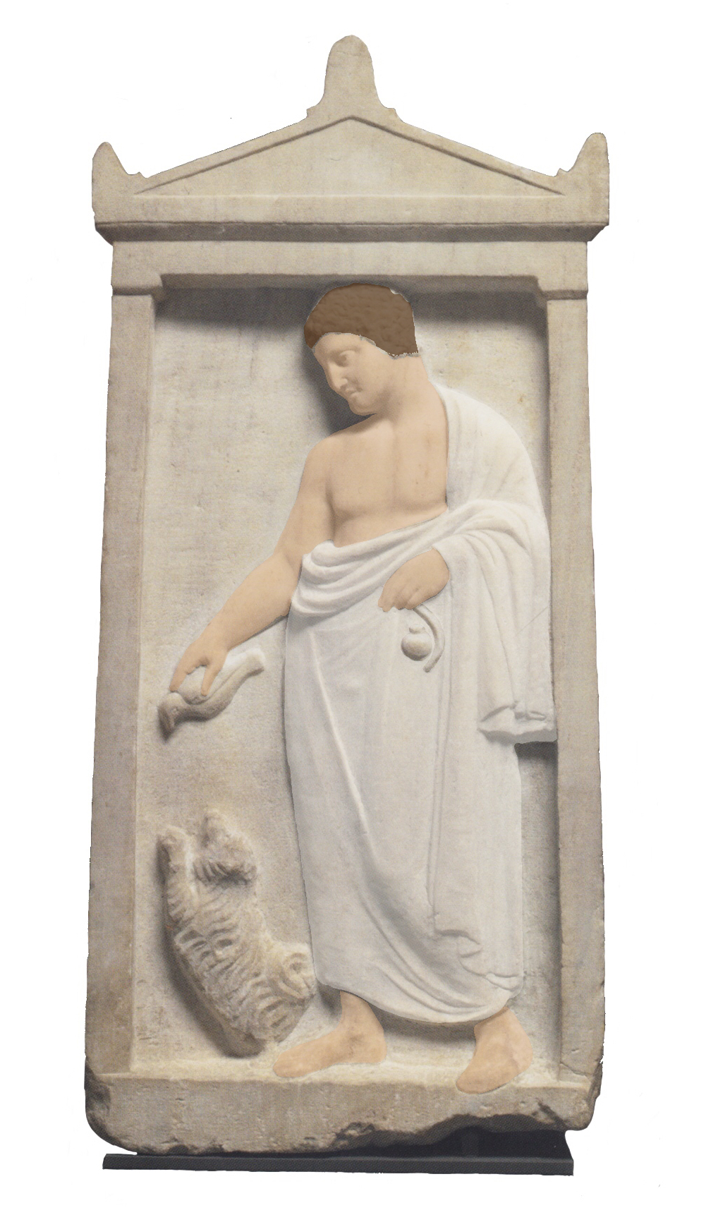 L’étude a porté sur la réception d’une création expérimentale réalisée spécialement pour l’exposition (fig.1) [12]. Il s’agit d’une stèle funéraire colorée créée de toutes pièces à partir de différentes sources matérielles, iconographiques et textuelles. Comme le titre du cartel l’indique, il s’agit d’une « création » car l’objet ne s’appuie pas sur un vestige authentique, il n’en est pas la restitution. Sa réalisation est « expérimentale » car des scientifiques ont eu recours à des matériaux utilisés dans l’Antiquité, selon les recettes qu’ils ont pu reconstituer [13]. La démarche de l’archéologie expérimentale permet aux archéologues de retrouver, par la pratique, les gestes qui ont présidé à la réalisation des vestiges qui leur sont parvenus. Elle permet de mieux comprendre le travail des artisans, de vérifier des hypothèses et de proposer des restitutions de l’état originel des objets. Concernant la mise en couleur de la stèle expérimentale, les liants et les pigments utilisés sont ceux dont l’existence est attestée pour l’époque archaïque (noir de vigne, terre de sienne, ocre rouge, blanc de plomb, cinabre, malachite, ocre jaune, bleu égyptien, laque de garance).