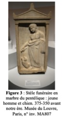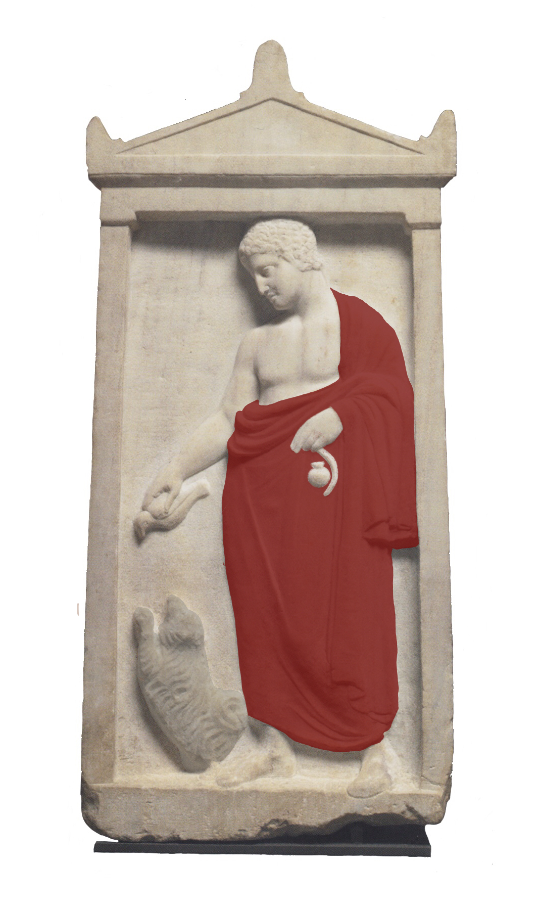 La partie explicative du cartel de la stèle précise que « les stèles funéraires représentant le défunt étaient systématiquement peintes, même lorsqu’elles étaient sculptées. Elles étaient ointes d’huile parfumée et ornées de bandelettes de tissu, au moment des funérailles ou lors des cérémonies d’hommage au défunt ». Par un travail interprétatif d’extrapolation, le visiteur est invité à imaginer de façon plus fidèle l’état originel des trois stèles authentiques placées à droite du dispositif (fig.2). La stèle expérimentale et son cartel sont censés favoriser un autre point de vue sur les objets originaux : par le texte qui précise que toutes les stèles étaient peintes même lorsqu’elles étaient sculptées et par l’image qui donne à voir un exemple de mise en couleur antique sur marbre, fait d’une gamme chromatique variée et des teintes vives. Deux facteurs peuvent toutefois contribuer à rendre ce travail interprétatif délicat. Premièrement, le motif de la création expérimentale est uniquement dessiné et peint, il n’est pas sculpté comme le sont ceux des stèles originales. Or c’est bien sur les objets en relief qu’il est difficile de concevoir une polychromie originelle (à l’image de la statuaire), comme le précise d’ailleurs le cartel de la stèle expérimentale par l’accentuation « même lorsqu’elles étaient sculptées ». Deuxièmement, aucune mention de couleur n’est faite sur le cartel des stèles originales, ce qui pourrait amener le visiteur à douter du caractère systématique de la peinture.