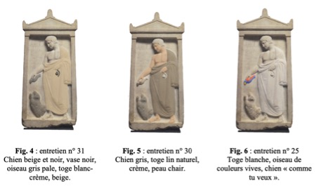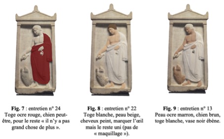 Dans un premier temps, nous demandons au visiteur comment il s’imagine la nécropole antique afin de voir s’il intègre ou non la couleur dans sa représentation. Nous poursuivons sur la lecture du cartel de la stèle colorée pour identifier si le visiteur relève de lui-même la mention « systématiquement peinte » et s’il extrapole alors cette information aux objets authentiques exposés à côté. Nous lui demandons enfin de décrire les couleurs originelles possibles qu’il imagine sur un des objets authentiques choisi au préalable (fig. 3) pour identifier la nature du transfert pouvant être fait.