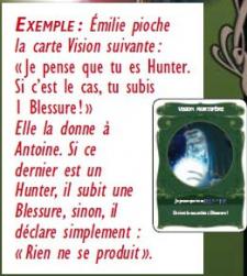 Précisons toutefois que cette répartition ne tient pas compte de la forte imbrication de différents éléments qui, en principe, sont indissociables. La sémantique associée au jeu est ici essentielle : il s’agit de l’ensemble qui comprend à la fois le vocable, les illustrations et les associations d’idées et références qui y sont liées. Par exemple, l’un des Shadow (camp regroupant des monstres folkloriques traditionnellement considérés comme maléfiques) est un Vampire, dont la capacité spéciale est Morsure. Cette capacité lui permet, si son identité est révélée, de soigner ses blessures lorsqu’il attaque un autre joueur ; on retrouve en termes de mécanique la représentation folklorique du vampire qui prolonge sa vie en se nourrissant du sang de ses victimes. Cette sémantique est nécessaire à la description et la compréhension des mécanismes de jeu, en particulier la capacité spéciale, le camp d’appartenance, et le nom. Par exemple, afin de dissimuler les différents rôles qu’incarnent les joueurs, la piste des points de vie est la même pour tous ; mais lorsqu’un joueur accumule plus de blessures que le maximum indiqué sur sa carte personnage (voir extrait du livret de règles 1), il doit alors révéler la mort de son personnage. Le maximum de « dégâts » tolérés par un personnage peut varier du simple au double.