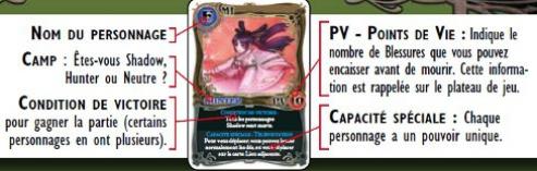 En début de partie les joueurs se voient distribuer, face cachée (c’est-à-dire sans qu’aucun autre joueur ne puisse en avoir connaissance, excepté celui qui la reçoit), une identité fictive (voir ci-dessus extrait du livret de règles 1) qui comporte objectif, capacité, nombre de points de vie, particularité et alliés différents en termes de mécanique ; cette carte comporte aussi un nom, une représentation figurative et un vocabulaire sémantiquement associé et propre au personnage (amour maternel pour un personnage féminin, par exemple). Pour reprendre ce que nous avons dit plus haut, il s’agit d’un rôle à la fois postural (chaque joueur appartient à un camp avec des objectifs différenciés), et précis (chaque joueur incarne un personnage). Chaque personnage possède un groupe d’alliés : respectivement les Shadow (les « ombres »), les Hunters (les « chasseurs »), et les Neutres. Les deux premiers camps doivent mutuellement s’anéantir, le premier à détruire le camp adverse remportant la partie. Tandis que les Neutres possèdent des objectifs propres et différents pour chaque personnage, ils l’emportent sur tous les autres dès que leur objectif est atteint. Ces derniers jouent donc seuls, bien qu’ils représentent un enjeu pour les deux autres camps : en effet les Shadow peuvent aussi gagner la partie s’ils tuent la totalité des Neutres et la majeure partie des Hunter. Par conséquent, ces derniers auront tout intérêt à protéger les Neutres qui, par ailleurs, peuvent avoir pour objectif le ralliement au camp des Hunter s’ils échouent dans leur objectif premier. Toutes les identités sont dissimulées en début de partie, si bien que personne ne sait lequel est son allié, lequel est son ennemi. Un joueur peut cependant choisir à tout moment de révéler son identité fictive, afin de bénéficier du pouvoir de son personnage. S’ajoute à cela des cartes piochées au cours du jeu qui permettent d’augmenter sa force de combat, de se soigner, de se protéger ou d’en apprendre potentiellement plus sur l’identité d’un joueur. Au fur et à mesure de la partie, les joueurs en sauront plus sur la répartition des identités fictives, ou tout du moins, ils en apprendront davantage sur le groupe auquel l’un ou l’autre appartient. Chaque tour se déroule de la façon suivante : le joueur qui agit doit d’abord se déplacer (obligatoire), utiliser l’une des possibilités conférées par le lieu où il se trouve (le plus souvent piocher des cartes d’un type particulier), et enfin, s’il le souhaite, attaquer un autre joueur à sa portée, c’est-à-dire, situé dans la même zone/territoire que lui.