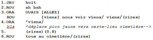 L’usage des déictiques, ces mots qui font référence à la situation d’énonciation, est particulièrement présent dans les échanges entre les joueurs. Ces déictiques ne se réfèrent pas à la pièce où se trouvent les joueurs, ni même à la table, mais bien à la situation du cadre du jeu. Lorsque les joueurs disent à l’un d’entre eux « allez viens », ils désignent par ce biais la position des pions sur le plateau, et celle future du pion du joueur Jaune qui va rejoindre la case où se trouvent déjà les pions de Rouge et de Orange. Les joueurs ici s’amusent de la succession de hasard, peu probable, qui a conduit trois sur cinq d’entre eux à se retrouver coup sur coup sur le même lieu – le cimetière – aléa d’autant plus improbable que ces trois joueurs se trouvaient au tour d’avant sur le même territoire (ensemble de deux lieux, voir extrait du livret de jeu 2 ci-dessus).