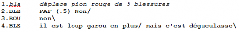 Cet autre exemple nous montre qu’outre le comportement du joueur, certains éléments du jeu peuvent aussi livrer des informations sur les identités de chacun. Ainsi, le rôle de loup garou est celui qui, chez les Shadow, possède le plus de points de vie. Rouge ayant atteint une quantité de blessures (tour 1) qui aurait provoqué la mort de tout autre rôle, le joueur Bleu en soutire une information supplémentaire sur son identité (tour 4).