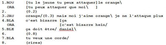 Le choix que fait Jaune de ne plus attaquer le joueur Orange (tour 3) est considéré comme révélateur par les autres joueurs (tour 4). En effet, jusque-là, le joueur Jaune avait systématiquement attaqué le joueur Orange, jusqu’à ce qu’il joue une carte vision lui permettant de voir la carte de ce dernier. Au moment de l’extrait, c’est la première fois qu’il peut attaquer le joueur Orange après avoir vu la carte rôle de ce dernier. Les autres joueurs qui savent déjà que le joueur Jaune possède un autre allié, le joueur Bleu, tirent la conclusion, en observant le changement d’attitude de Jaune, que le joueur Orange détient la carte rôle « Daniel » ; conclusion qu’ils traitent avec humour en détournant les objectifs fictifs du rôle que le joueur Orange possède [21].