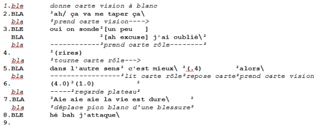 Cet article utilise une version simplifiée de la convention de transcription du laboratoire ICAR. Pour cet article, seuls les éléments importants pour la compréhension du déroulement de l’action ont été retranscrits. La numérotation se fait par tour de parole, qui comprend les propos et actions réalisés en chevauchement.