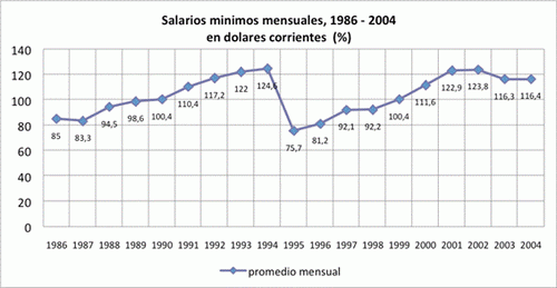 Aussi, les variations de salaire résultent de l’ajustement structurel de l’économie et de la politique du FMI. Comme le montre le graphique 1, la chute la plus importante du salaire minimum a eu lieu de 1994-1995. Après 1996, le salaire minimum a connu une lente amélioration mais il a chuté de nouveau en 2003.