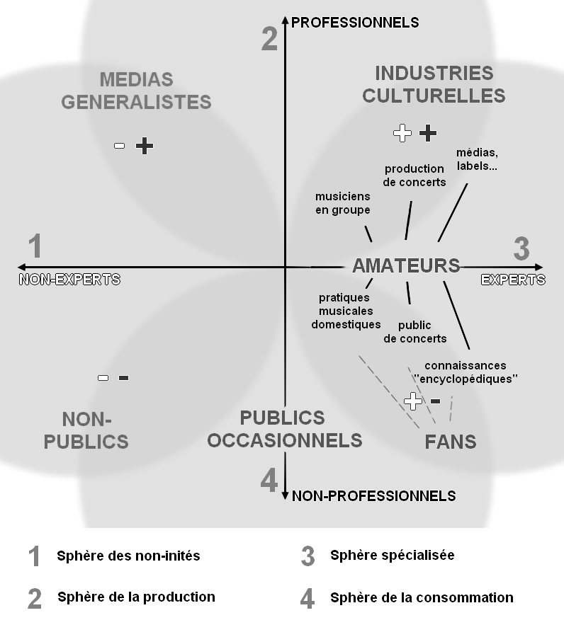 Loin de prétendre pouvoir capter toute la complexité de la répartition des modalités de l’engagement au sein des mondes musicaux, cette schématisation traduit une volonté de déplacer le point de vue de l’analyse des scènes musicales, afin d’éclairer le jeu du partage des espaces et des frontières symboliques entre publics d’initiés et de non-initiés. Cette représentation des mondes musicaux permet ainsi de dégager deux pôles de l’engagement des publics : celui qui se manifeste à travers le degré de consommation, et celui de l’engagement personnel des amateurs dans des formes d’expertises qui sont liées à l’action.