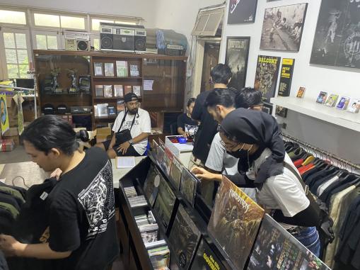 À l’intérieur, des jeunes garçons souvent vêtus de noir et quelques jeunes femmes arborant hidjab et T-shirts siglés de leur groupe de metal préféré se pressent autour des bacs de disques vinyles et de CD, des étagères remplies de cassettes audio et des présentoirs de vêtements. Les murs sont couverts de sérigraphies réalisées par Ucok (qui conçoit aussi les pochettes d’albums du label) tandis que des vitrines de livres et de revues achèvent de compléter l’offre. Le merchandising est la principale source de revenu des labels de la scène undergroundde Bandung, dont la production musicale est pensée comme un moyen de vendre des produits dérivés :
