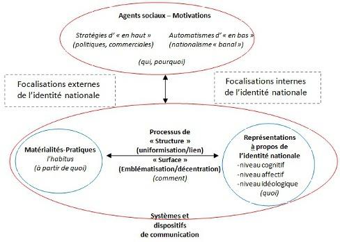 La figure n° 1 propose un schéma illustrant la construction des identités nationales. Il s’agit d’une modélisation inédite visant à expliquer, sans parti pris ni jugement de valeur, les étapes de ce processus et les agents qui y interviennent. Elle ouvre à ce titre un espace pour l’étude des identités nationales en tant que phénomènes complexes au sein des sociétés contemporaines dites ’développées’. Contrairement à la majorité des travaux relatifs aux nations qui s’interrogent sur l’apparition historique de celles-ci et aux structures macrosociales qui l’ont sous-tendue, cette approche s’intéresse aux relations que la nation entretient avec les pratiques et les structures quotidiennes qui la maintiennent et la réinventent au niveau microsocial. Le modèle proposé ici appréhende la formation des identités nationales en tant que processus dynamique, façonné par deux mouvements d’interaction principaux : celui entre matérialités/pratiques et représentations ; celui entre systèmes de communication et motivations des agents sociaux. Le premier (en bleu) concerne davantage le contenu, à savoir les dimensions objectivantes et subjectives de l’identité nationale, tandis que le second (en rouge) focalise plus particulièrement sur la question des pouvoirs (dispositifs et stratégies) qui sous-tendent sa formation.