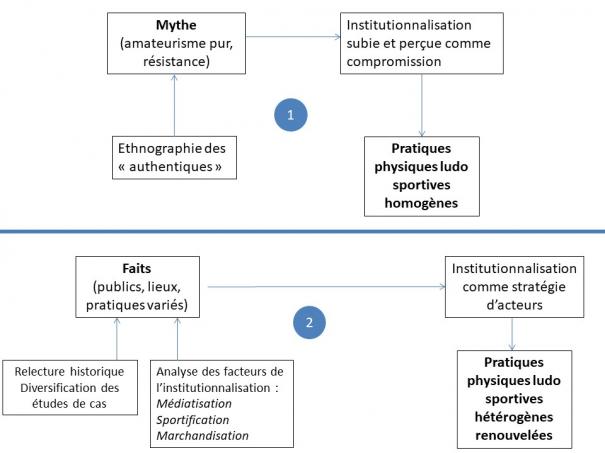 En nous appuyant sur les travaux de Suchet et Tuppen sur l’évolution des dynamiques sportives de nature en France (2014) et de Courchesnes-O’Neill sur l’institutionnalisation de la planche à neige au Canada (2009), nous pouvons regrouper trois entrées théoriques et méthodologiques dans l’étude des sports ’alternatifs’.