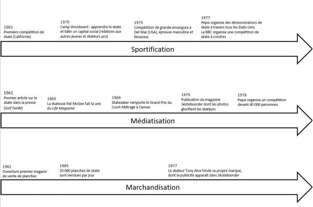 Enfin, la dernière partie peut être considérée comme un terrain, non au sens ethnographique mais dans la mesure où la recherche d’archives et de documents historiques alimente un travail de recherche originale. Nous proposons de discuter de l’application du modèle à la pratique du skateboard en nous basant sur un travail de dépouillement d’archives dont l’objectif est de questionner la marginalité de la pratique du skateboard. Pour former cette base de données, nous avons travaillé en deux temps. D’abord, nous avons effectué une revue de la littérature basée sur des travaux académiques qui portaient sur le skateboard en général. Outre ces travaux scientifiques, nous nous sommes appuyés sur les archives en ligne des magazines Trasher, Skateboarding et TransWorldSkateboarding Magazine, ainsi que sur les ouvrages de quelques passionnés pour construire une histoire renouvelée de la diffusion de la pratique à l’échelle internationale. L’objectif était de produire une chronologie (figure 3) qui illustre les dynamiques historiques de l’institutionnalisation de la pratique du skateboard.