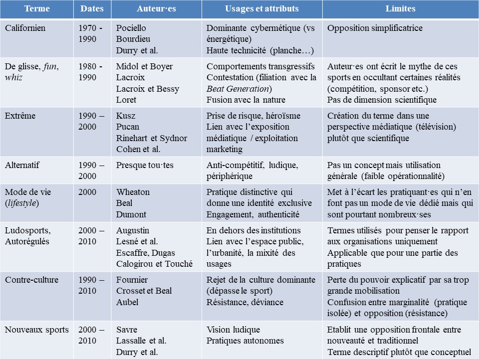 À la suite de l’analyse des travaux, neuf catégories synthétiques ont été produites. Même si toute catégorisation est par nature artificielle, car simplificatrice, elle permet néanmoins de faire émerger des positionnements éclairants. L’objectif ici n’est pas de se positionner sur un terme mais de comprendre, dans une perspective pluridisciplinaire, comment ceux-ci sont mobilisés et quels sont leurs fondements (ou non). Le tableau 1 montre que les termes sont souvent plus des qualificatifs que des concepts dans la mesure où ils ne forment pas des abstractions qui peuvent être étudiées en soi. Les concepts étant la base des connaissances scientifiques, on voit ici que ’alternatif’ ou ’nouveau’ ne peuvent pas être mobilisés en tant que tels car ils ne peuvent expliquer des mécanismes sociaux généraux. Ainsi, comme le note Kusz (2004) à propos du terme ’extrême’, des activités éparses ont été artificiellement agrégées sous un vocable commun sans bénéfice pour éclairer la singularité des disciplines. Les sports ’d’action’, qui veulent se distancier de l’appellation ’extrême’ jugée trop médiatique, se situent pourtant dans la continuité en utilisant des attributs similaires (importance du spectacle et risque). En outre, la définition proposée par Breivik (2010) se base sur des qualifications limitées (réaliser une performance face à l’anxiété et au stress) ou encore un besoin de compétences (liées au corps et à l’esprit), qui ne permettent pas une singularisation par rapport à d’autres pratiques physiques.