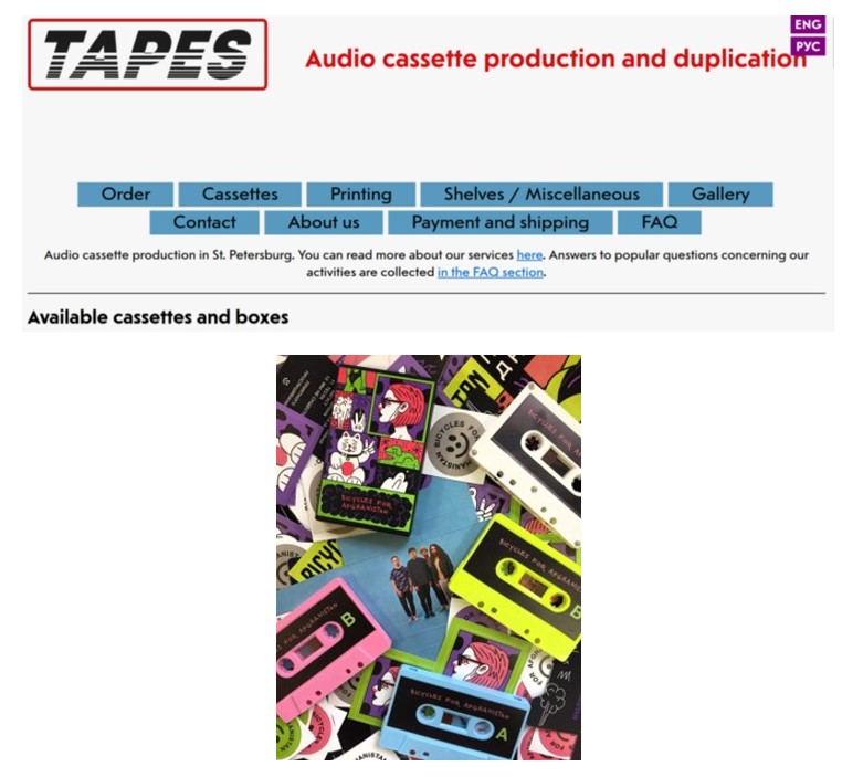 La manufacture Tapes, fondée à Saint-Pétersbourg en 2013 [10], a réalisé 935 commandes en 2021 (42 000 cassettes), 607 commandes en 2022 (près de 30 000 cassettes, la baisse d’un quart induite par une crise liée à la guerre) et 621 commandes en 2023 (près de 33 000 cassettes). Elle est sous le statut juridique d’« entrepreneur individuel » et paie à ce titre des impôts. Il ne s’agit donc pas d’un travail ’au noir’ comme c’est le cas des labels DIY. À ce jour, huit employés sont sous contrat avec l’entreprise.