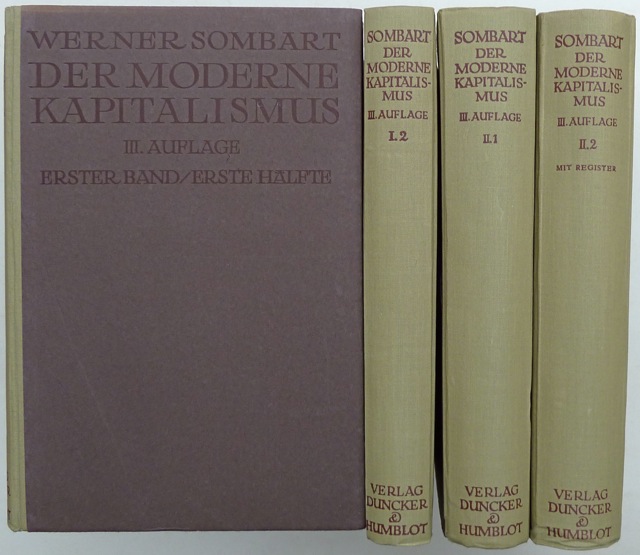 De tous les ouvrages de Sombart, le plus important tant par son volume (plus de 3 000 pages en six tomes) que par sa portée est Der moderne Kapitalismus. Sombart en a fait paraître en 1902 les quatre premiers tomes, consacrés à la genèse du capitalisme dans le Moyen Age occidental et à la première phase de l’histoire du capitalisme correspondant en gros aux temps modernes – des « grandes découvertes » de la seconde moitié du XVe siècle à la « révolution industrielle » qui se produit en Angleterre dans la seconde moitié du XVIIIe siècle – période qu’il dénomme Frühkapitalismus (ce qu’on pourrait traduire par protocapitalisme). Il en a assuré une seconde édition en 1916, souvent profondément modifiée pour tenir compte de l’ensemble des critiques soulevées par la première édition, notamment de la part d’historiens – car l’ouvrage fut abondamment discutée dans l’Allemagne des années 1900 et 1910. Il en a enfin publié une troisième et dernière édition en 1928, là encore revue et corrigée, mais aussi augmentée des deux derniers tomes portant sur la seconde période de l’histoire du capitalisme allant de la « révolution industrielle » jusqu’à la veille de la première Guerre mondiale – période qu’il dénomme par opposition à la précédente Hochkapitalismus, que l’on pourrai traduire par capitalisme développé [2].